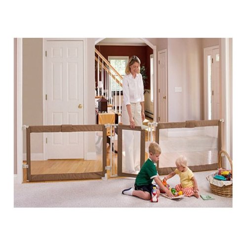 The Sumer Infant Custom-Fit gate lets you tackle the dilemma of cordoning off unusual openings and areas in your house. Being as much as 12 feet wide or as little as six feet, the Custom-Fit gives you the freedom of blocking staircases or for use in extended openings--think living room. The gate comes with hardware to mount to the walls and a template; all you need is a screwdriver. The locking door swings both directions for easy passage without removing the entire gate-- no more hurdling to save time. The fabric is soft and durable, and the panes are pretty much transparent, so the little ones won't miss any of the action when behind the gate. No bars or metal and wood also reduce the likelihood of injury. --Scott Teal